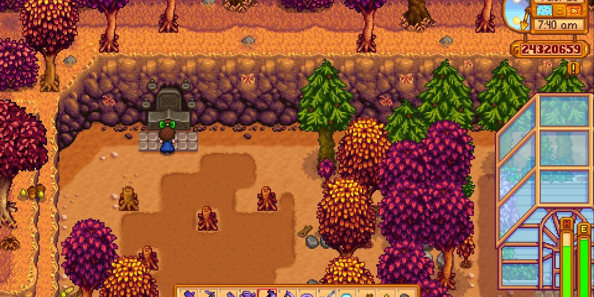 Ảnh chụp màn hình một trang trại Ancient Fruit khổng lồ trong Stardew Valley